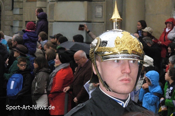 Die Wache wird von einem Musikkorps in historischen Uniformen begleitet.