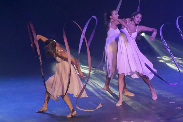 Musicaldarstellerin Nadine Stockmann mit einem Trio rhythmischer Sportgymnastiinnen